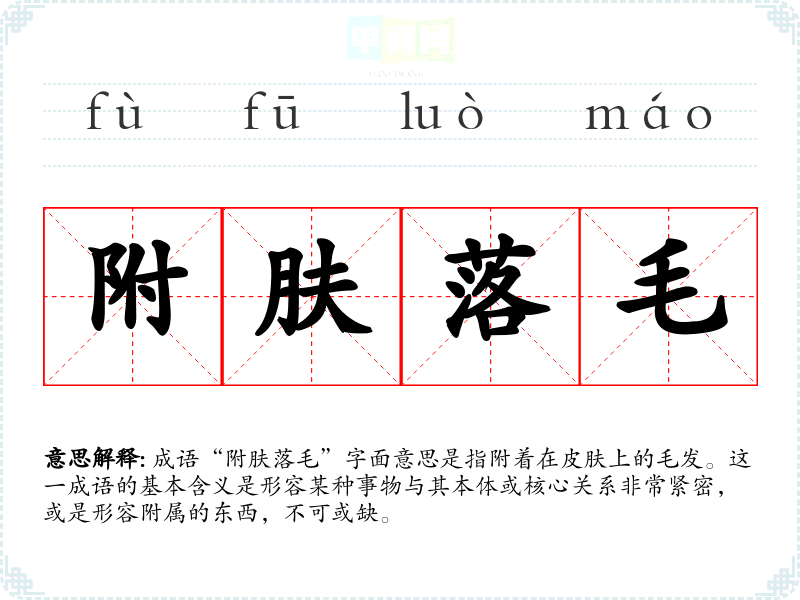 成语“附肤落毛”字面意思是指附着在皮肤上的毛发。这一成语的基本含义是形容某种事物与其本体或核心关系非常紧密,或是形容附属的东西,不可或缺。