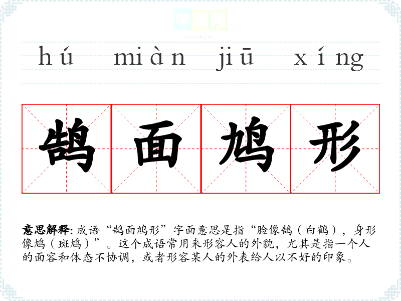 成语“鹄面鸠形”字面意思是指“脸像鹄(白鹤),身形像鸠(斑鸠)”。这个成语常用来形容人的外貌,尤其是指一个人的面容和体态不协调,或者形容某人的外表给人以不好的印象。