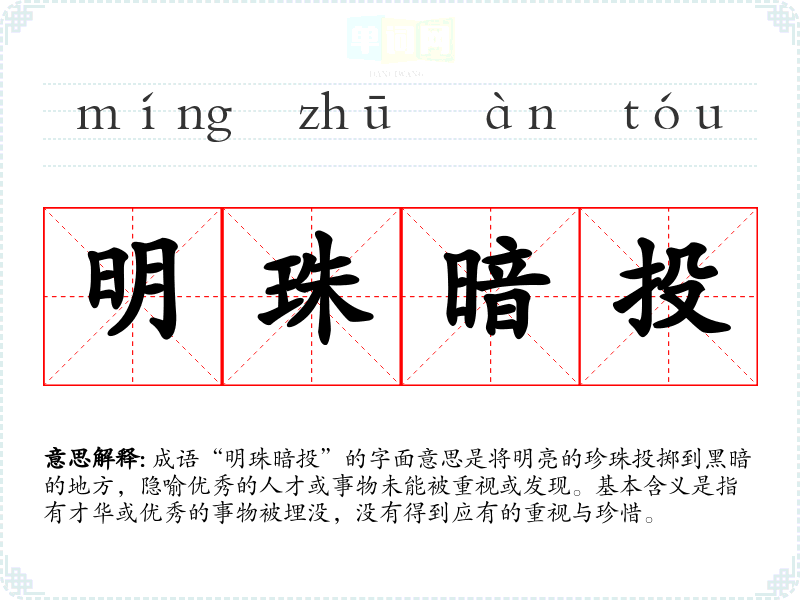 成语“明珠暗投”的字面意思是将明亮的珍珠投掷到黑暗的地方,隐喻优秀的人才或事物未能被重视或发现。基本含义是指有才华或优秀的事物被埋没,没有得到应有的重视与珍惜。