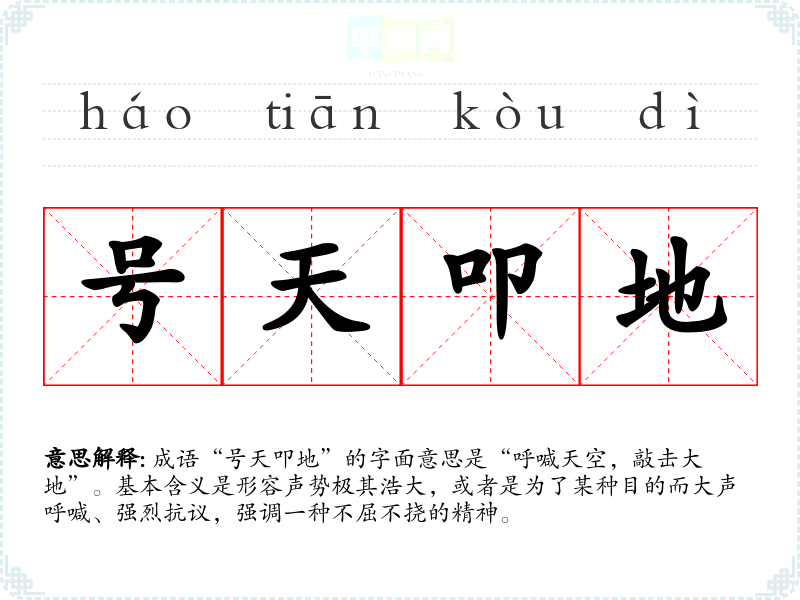 成语“号天叩地”的字面意思是“呼喊天空,敲击大地”。基本含义是形容声势极其浩大,或者是为了某种目的而大声呼喊、强烈抗议,强调一种不屈不挠的精神。