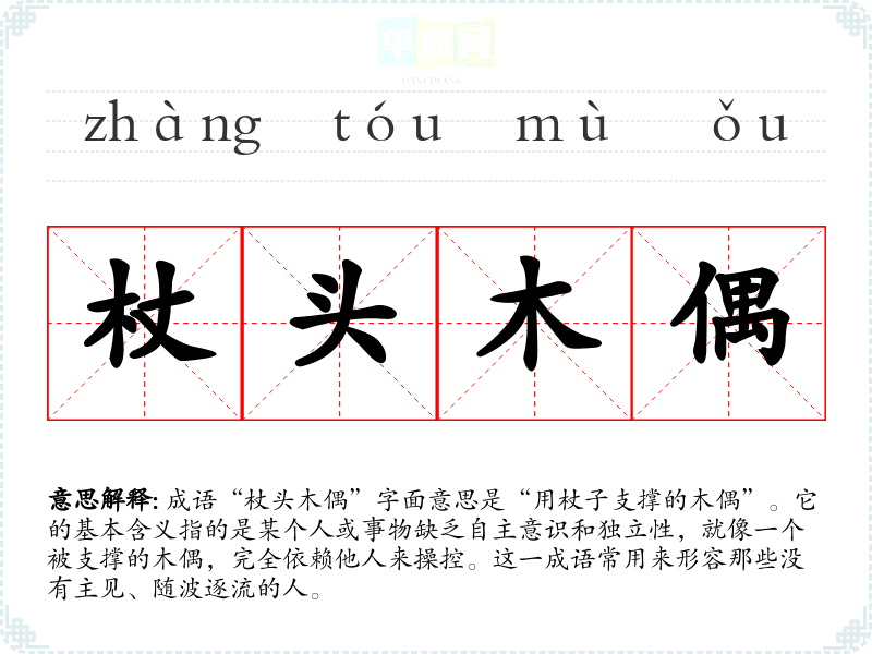 成语“杖头木偶”字面意思是“用杖子支撑的木偶”。它的基本含义指的是某个人或事物缺乏自主意识和独立性,就像一个被支撑的木偶,完全依赖他人来操控。这一成语常用来形容那些没有主见、随波逐流的人。