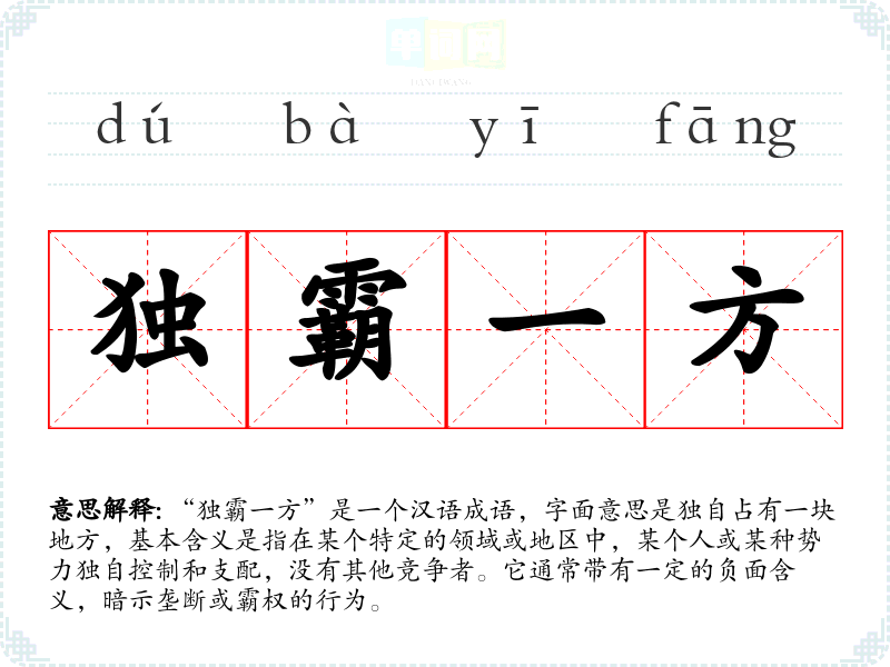 “独霸一方”是一个汉语成语,字面意思是独自占有一块地方,基本含义是指在某个特定的领域或地区中,某个人或某种势力独自控制和支配,没有其他竞争者。它通常带有一定的负面含义,暗示垄断或霸权的行为。
