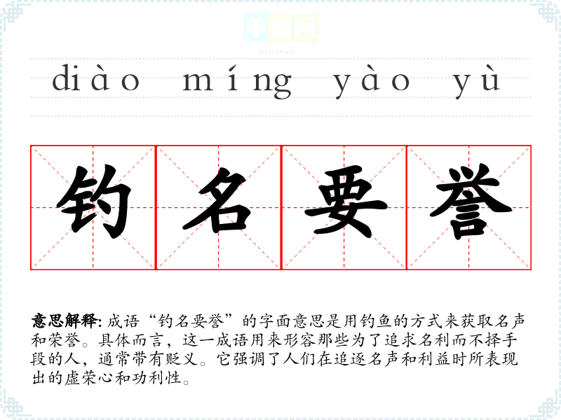 成语“钓名要誉”的字面意思是用钓鱼的方式来获取名声和荣誉。具体而言,这一成语用来形容那些为了追求名利而不择手段的人,通常带有贬义。它强调了人们在追逐名声和利益时所表现出的虚荣心和功利性。