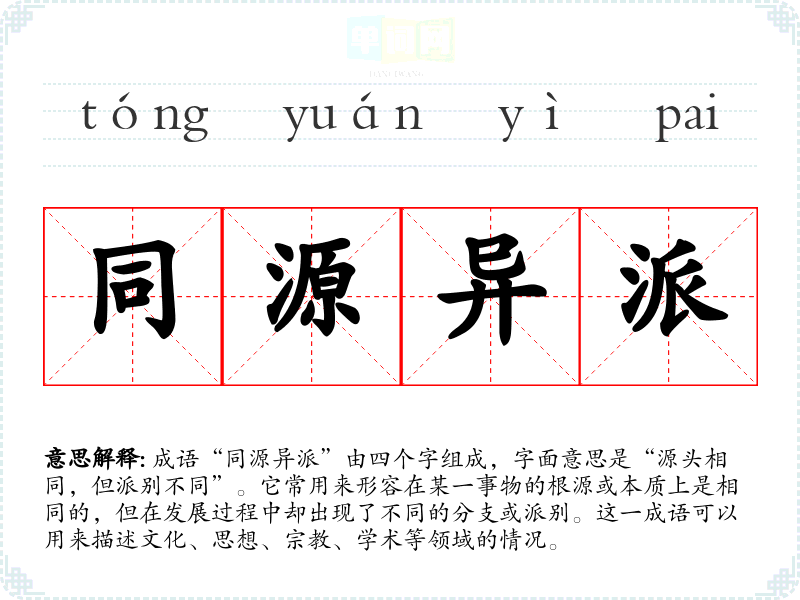 “同源异派”并没有明确的历史典故或特定的文学出处,它的构成可以追溯到对哲学、文化和的研究与讨论。类似的表达在传统文化中常用于描述不同的学派,如儒家与道家的分歧,尽管它们都源于**古代的思想文化。