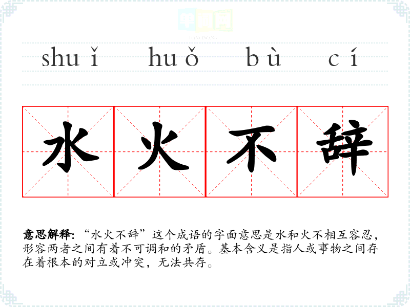 “水火不辞”这个成语的字面意思是水和火不相互容忍,形容两者之间有着不可调和的矛盾。基本含义是指人或事物之间存在着根本的对立或冲突,无法共存。