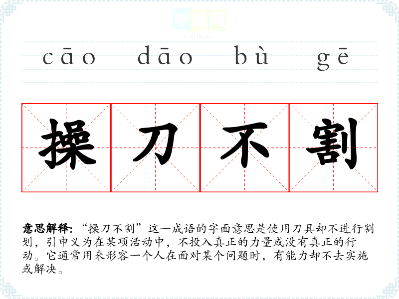 “操刀不割”这一成语的字面意思是使用刀具却不进行割划,引申义为在某项活动中,不投入真正的力量或没有真正的行动。它通常用来形容一个人在面对某个问题时,有能力却不去实施或解决。
