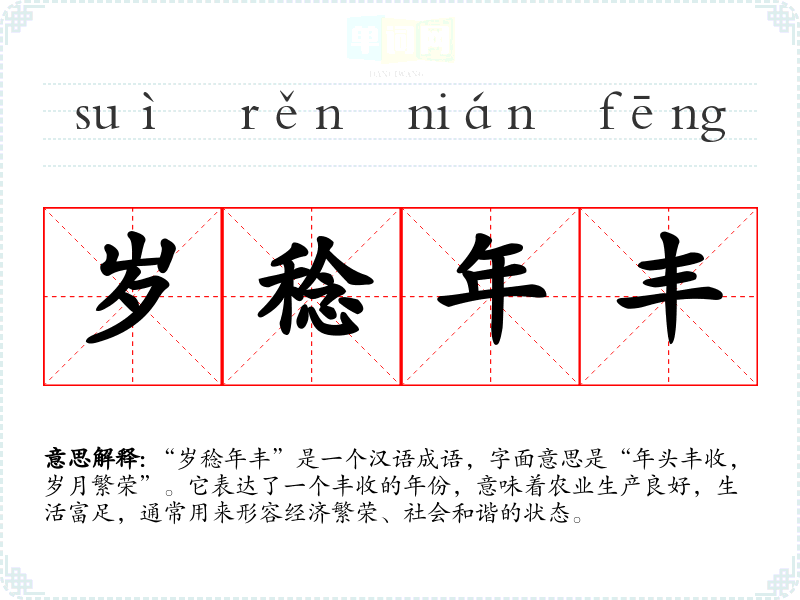 “岁稔年丰”是一个汉语成语,字面意思是“年头丰收,岁月繁荣”。它表达了一个丰收的年份,意味着农业生产良好,生活富足,通常用来形容经济繁荣、社会和谐的状态。