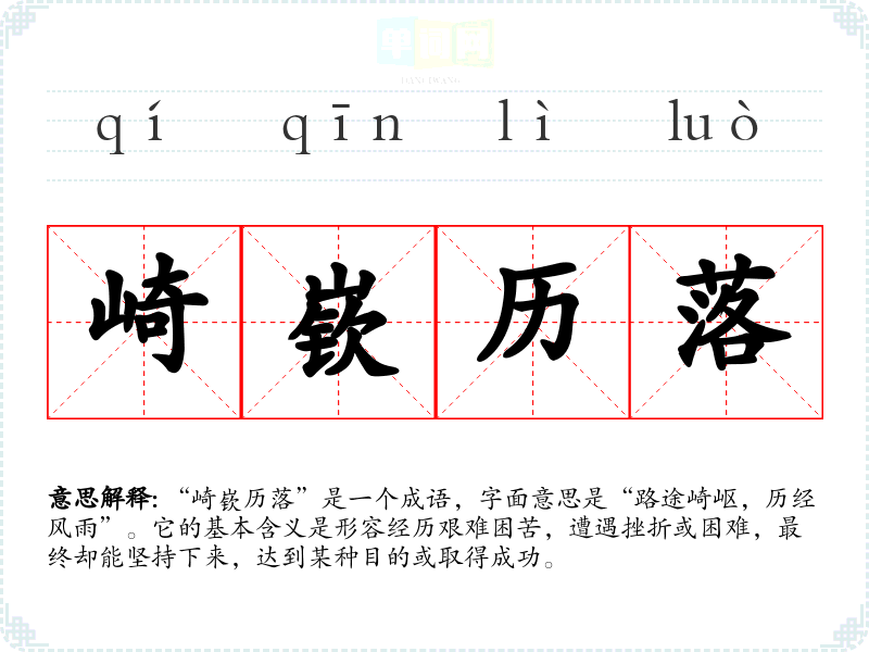 “崎嵚历落”是一个成语,字面意思是“路途崎岖,历经风雨”。它的基本含义是形容经历艰难困苦,遭遇挫折或困难,最终却能坚持下来,达到某种目的或取得成功。