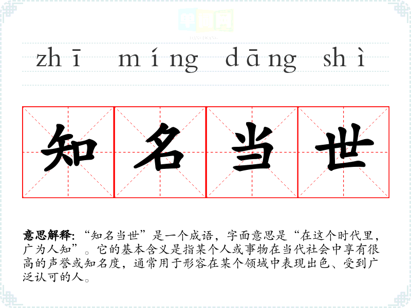 “知名当世”是一个成语,字面意思是“在这个时代里,广为人知”。它的基本含义是指某个人或事物在当代社会中享有很高的声誉或知名度,通常用于形容在某个领域中表现出色、受到广泛认可的人。