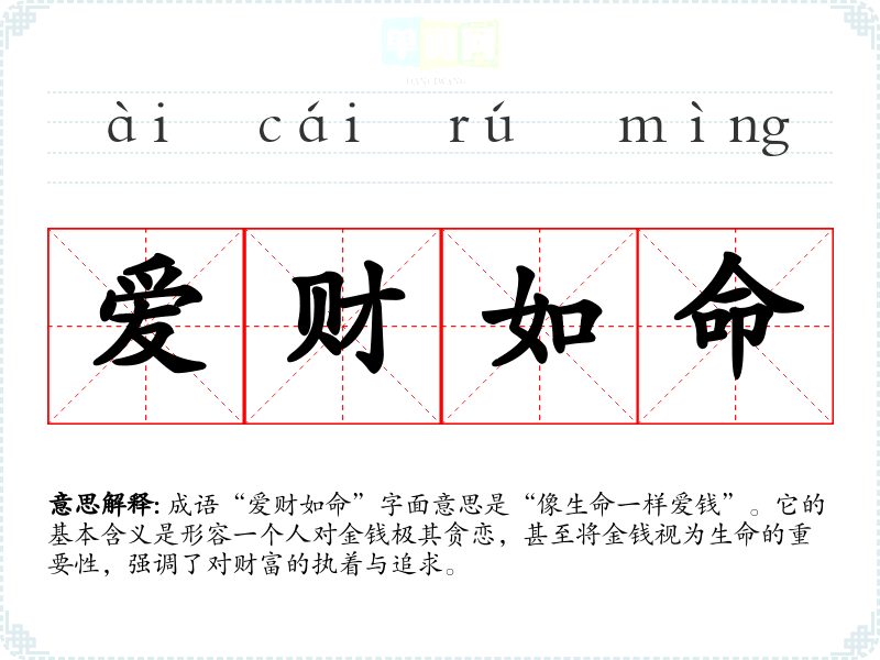 - 反义成语:如“淡泊明志”,强调对物质的淡然态度,与“爱财如命”形成鲜明对比。