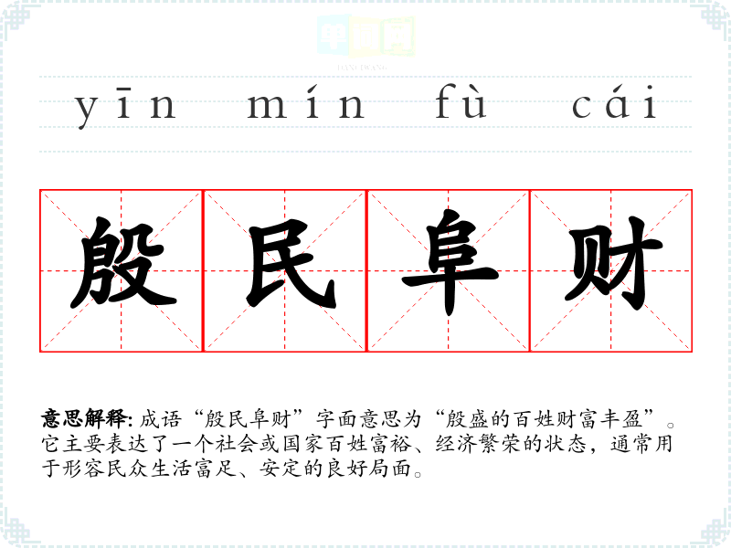 “殷民阜财”出自《尚书·大禹谟》,原文为“殷民阜财,和气致祥”。成语中的“殷”指的是殷商时期,代表一个繁荣的时代;“阜”意为丰盈、富饶;“财”则是财富、财物。这个成语强调了一个国家或地区的民生富足与和谐。