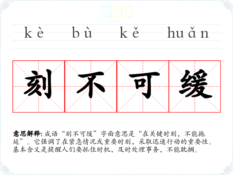 成语“刻不可缓”字面意思是“在关键时刻,不能拖延”。它强调了在紧急情况或重要时刻,采取迅速行动的重要性。基本含义是提醒人们要抓住时机,及时处理事务,不能耽搁。