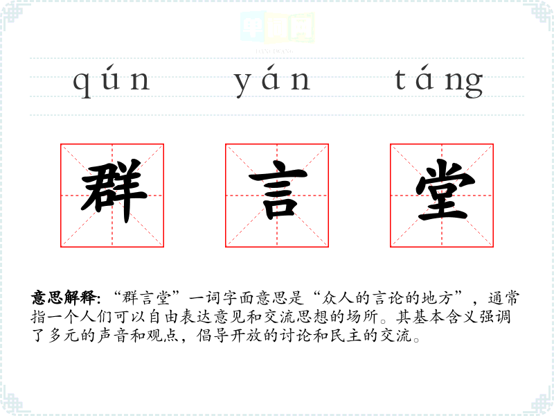 “群言堂”一词字面意思是“众人的言论的地方”,通常指一个人们可以自由表达意见和交流思想的场所。其基本含义强调了多元的声音和观点,倡导开放的讨论和民主的交流。