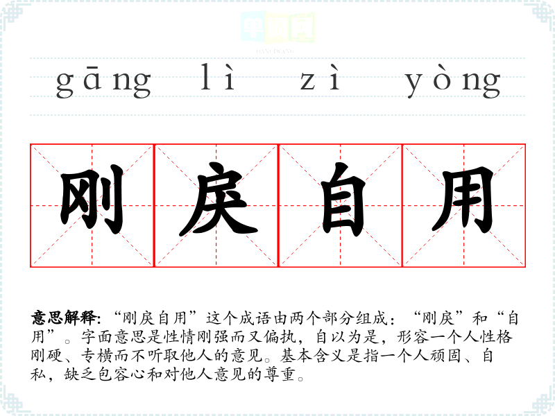 “刚戾自用”这个成语由两个部分组成:“刚戾”和“自用”。字面意思是性情刚强而又偏执,自以为是,形容一个人性格刚硬、专横而不听取他人的意见。基本含义是指一个人顽固、自私,缺乏包容心和对他人意见的尊重。