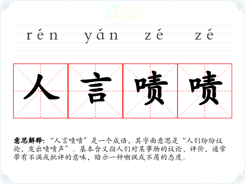 “人言啧啧”是一个成语,其字面意思是“人们纷纷议论,发出啧啧声”。基本含义指人们对某事物的议论、评价,通常带有不满或批评的意味,暗示一种嘲讽或不屑的态度。
