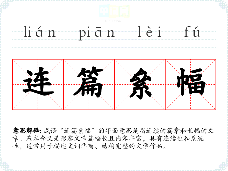 成语“连篇絫幅”的字面意思是指连续的篇章和长幅的文章。基本含义是形容文章篇幅长且内容丰富,具有连续性和系统性,通常用于描述文词华丽、结构完整的文学作品。