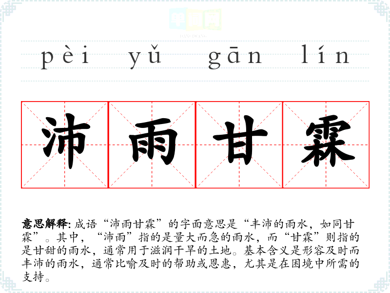 成语“沛雨甘霖”的字面意思是“丰沛的雨水,如同甘霖”。其中,“沛雨”指的是量大而急的雨水,而“甘霖”则指的是甘甜的雨水,通常用于滋润干旱的土地。基本含义是形容及时而丰沛的雨水,通常比喻及时的帮助或恩惠,尤其是在困境中所需的支持。