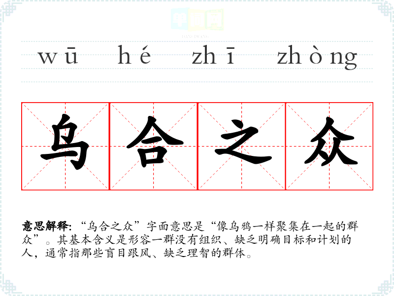 “乌合之众”字面意思是“像乌鸦一样聚集在一起的群众”。其基本含义是形容一群没有组织、缺乏明确目标和计划的人,通常指那些盲目跟风、缺乏理智的群体。