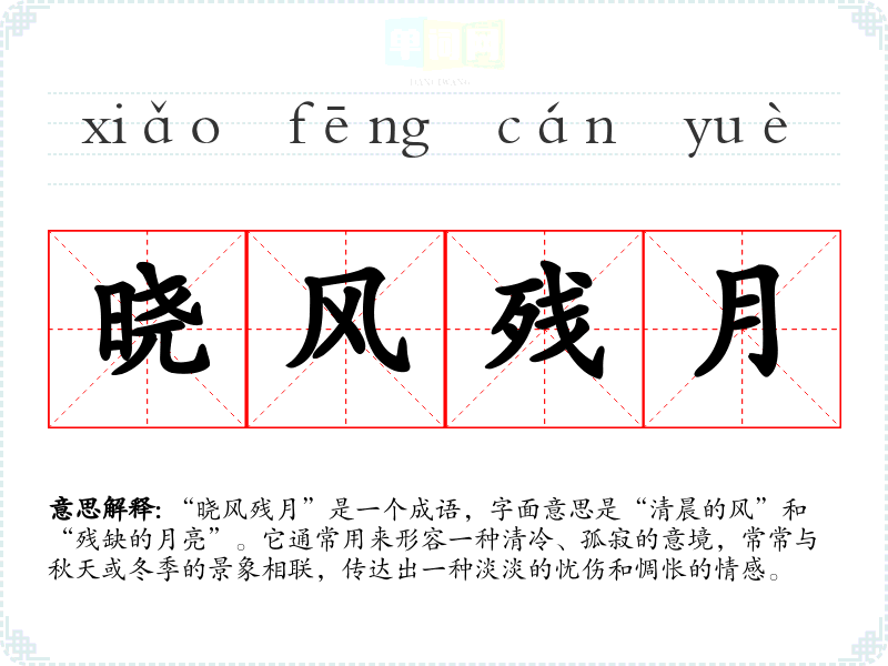 “晓风残月”是一个成语,字面意思是“清晨的风”和“残缺的月亮”。它通常用来形容一种清冷、孤寂的意境,常常与秋天或冬季的景象相联,传达出一种淡淡的忧伤和惆怅的情感。