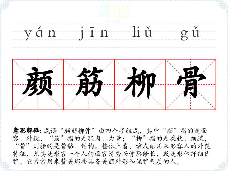 成语“颜筋柳骨”由四个字组成,其中“颜”指的是面容、外貌,“筋”指的是肌肉、力量;“柳”指的是柔软、细腻,“骨”则指的是骨骼、结构。整体上看,该成语用来形容人的外貌特征,尤其是形容一个人的面容清秀而骨骼修长,或是形体纤细优雅。它常常用来赞美那些具备美丽外形和优雅气质的人。