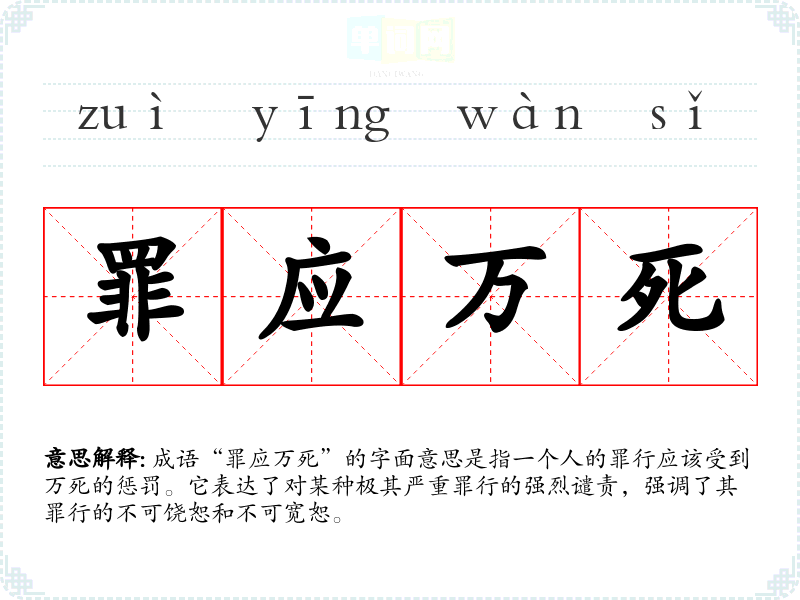 成语“罪应万死”源于古代对法律的严苛态度。在**历史上,许多朝代都对重罪有极其严厉的惩罚,尤其在封建社会,常常要求对严重罪行进行极刑。该成语并没有明确的文学出处,但其表达的思想在古代文学和历史文献中屡见不鲜,常用于描述罪犯应受的惩罚。