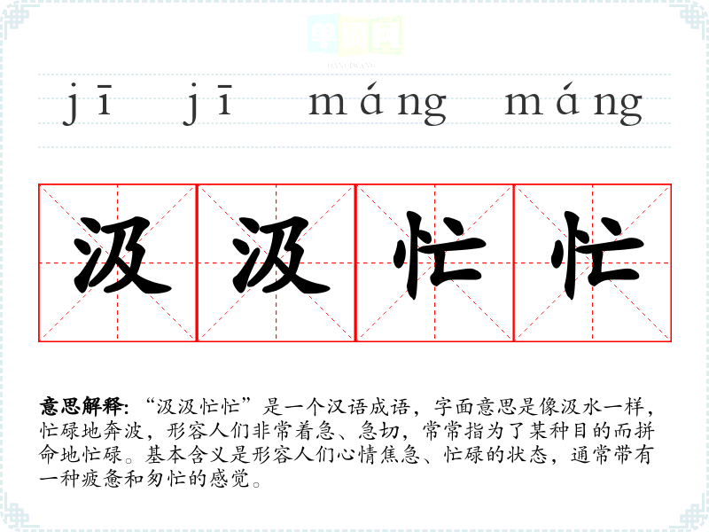 “汲汲忙忙”是一个汉语成语,字面意思是像汲水一样,忙碌地奔波,形容人们非常着急、急切,常常指为了某种目的而拼命地忙碌。基本含义是形容人们心情焦急、忙碌的状态,通常带有一种疲惫和匆忙的感觉。