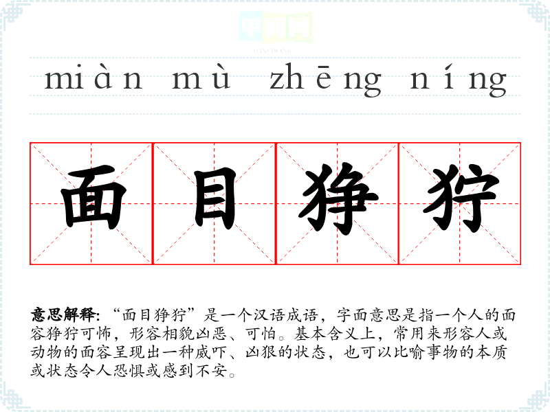 “面目狰狞”是一个汉语成语,字面意思是指一个人的面容狰狞可怖,形容相貌凶恶、可怕。基本含义上,常用来形容人或动物的面容呈现出一种威吓、凶狠的状态,也可以比喻事物的本质或状态令人恐惧或感到不安。