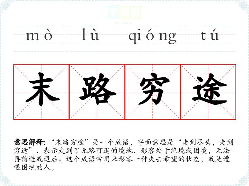“末路穷途”是一个成语,字面意思是“走到尽头,走到穷途”,表示走到了无路可退的境地,形容处于绝境或困境,无法再前进或退后。这个成语常用来形容一种失去希望的状态,或是遭遇困境的人。