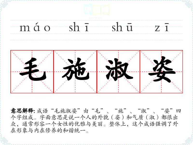 成语“毛施淑姿”由“毛”、“施”、“淑”、“姿”四个字组成。字面意思是说一个人的外貌(姿)和气质(淑)都很出众,通常形容一个女性的优雅与美丽。整体上,这个成语强调了外在形象与内在修养的和谐统一。