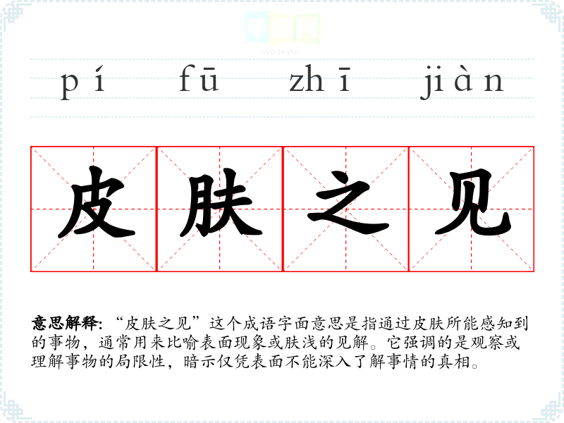 “皮肤之见”这个成语字面意思是指通过皮肤所能感知到的事物,通常用来比喻表面现象或肤浅的见解。它强调的是观察或理解事物的局限性,暗示仅凭表面不能深入了解事情的真相。