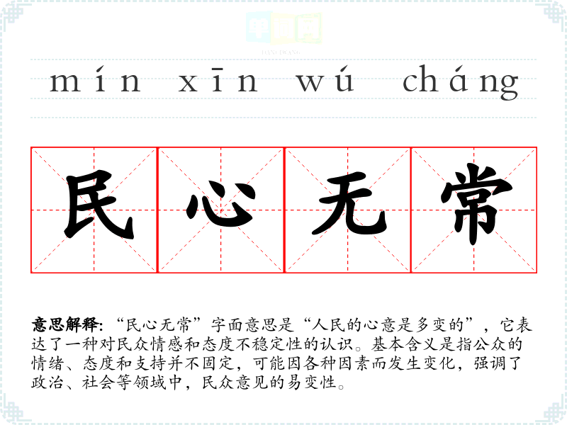 “民心无常”字面意思是“人民的心意是多变的”,它表达了一种对民众情感和态度不稳定性的认识。基本含义是指公众的情绪、态度和支持并不固定,可能因各种因素而发生变化,强调了政治、社会等领域中,民众意见的易变性。