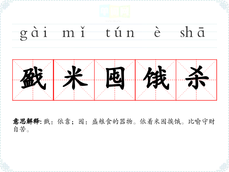 | 戤米囤饿杀 | 戤:依靠;囤:盛粮食的器物。依着米囤挨饿。比喻守财自苦。 |