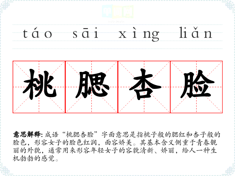 | 杏腮桃脸 | 形容女子容貌美丽。同“杏脸桃腮”。 |