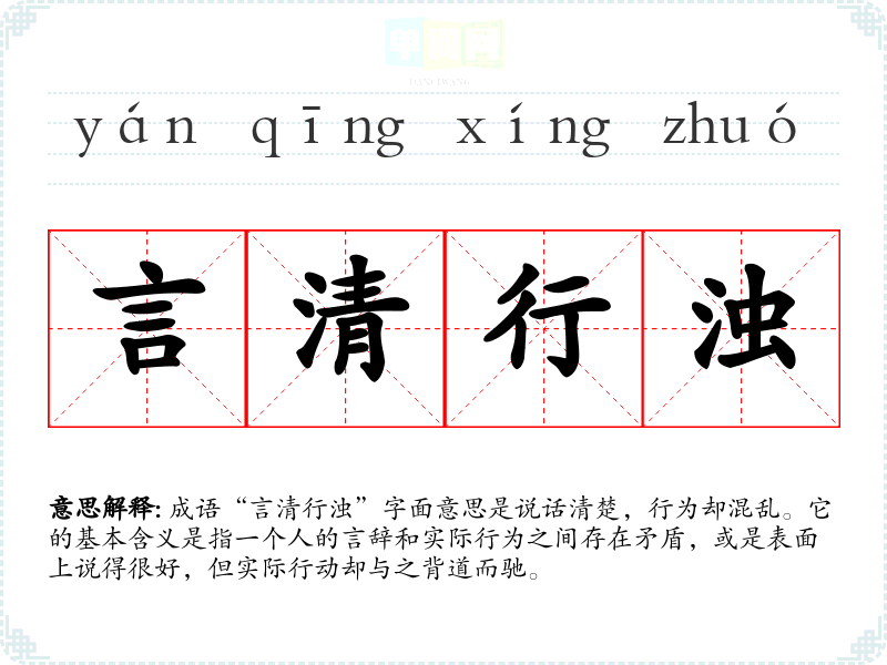 成语“言清行浊”字面意思是说话清楚,行为却混乱。它的基本含义是指一个人的言辞和实际行为之间存在矛盾,或是表面上说得很好,但实际行动却与之背道而驰。