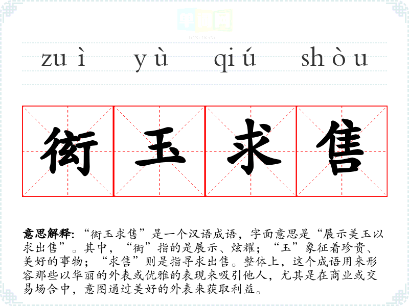 “衒玉求售”是一个汉语成语,字面意思是“展示美玉以求出售”。其中,“衒”指的是展示、炫耀;“玉”象征着珍贵、美好的事物;“求售”则是指寻求出售。整体上,这个成语用来形容那些以华丽的外表或优雅的表现来吸引他人,尤其是在商业或交易场合中,意图通过美好的外表来获取利益。
