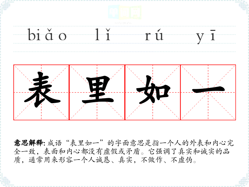 成语“表里如一”的字面意思是指一个人的外表和内心完全一致,表面和内心都没有虚假或矛盾。它强调了真实和诚实的品质,通常用来形容一个人诚恳、真实,不做作、不虚伪。