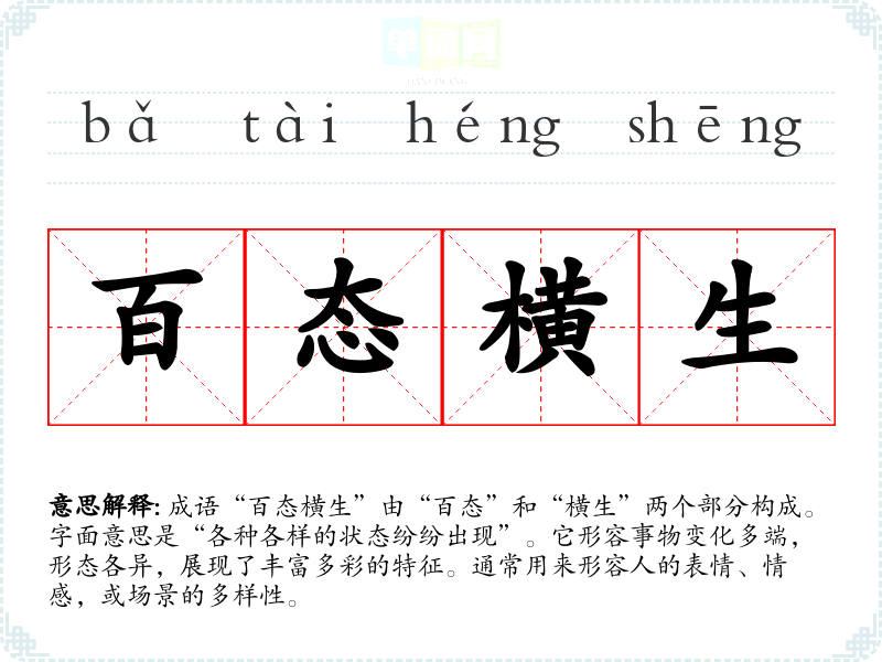 “百态”意指各种各样的状态,“横生”则表示意外产生或呈现。该成语的确切来源并不明确,但在古代文学中,类似的表达常用于描述自然界或人类社会的多样性,体现了**文化中对变化和多样性的理解。