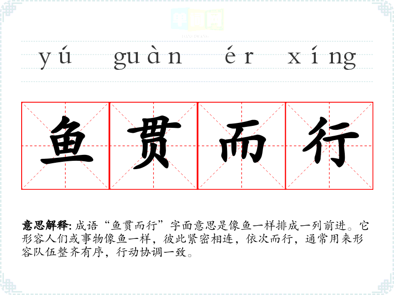 “鱼贯而行”出自《史记·平原君赵成》,原句描述的是一群人像鱼一样排成一列,形象地表现了他们整齐的行进方式。这种比喻生动地描绘了团队的团结和有序,强调了集体行动的协调性。