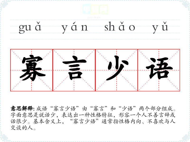 成语“寡言少语”由“寡言”和“少语”两个部分组成。字面意思是说话少,表达出一种性格特征,形容一个人不善言辞或话很少。基本含义上,“寡言少语”通常指性格内向、不喜欢与人交谈的人。