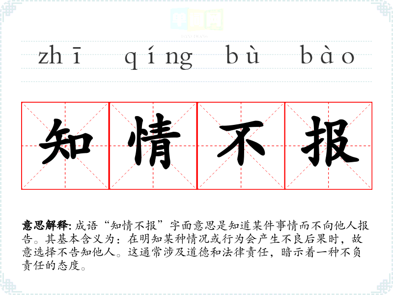 成语“知情不报”字面意思是知道某件事情而不向他人报告。其基本含义为:在明知某种情况或行为会产生不良后果时,故意选择不告知他人。这通常涉及道德和法律责任,暗示着一种不负责任的态度。