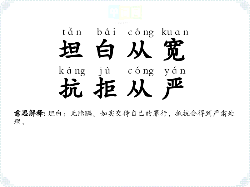 | 坦白从宽,抗拒从严 | 坦白:无隐瞒。如实交待自己的罪行,抵抗会得到严肃处理。 |