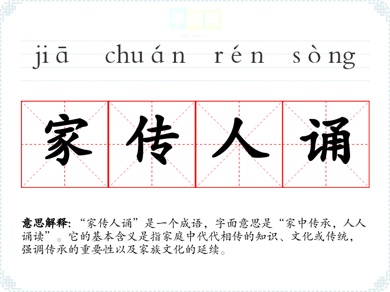 “家传人诵”不仅是一个成语,更是一种文化价值的体现。它提醒我们重视家庭和传统的传承,在语言学*和表达中,它增加了对文化背景的理解和对家庭的重要性的思考。