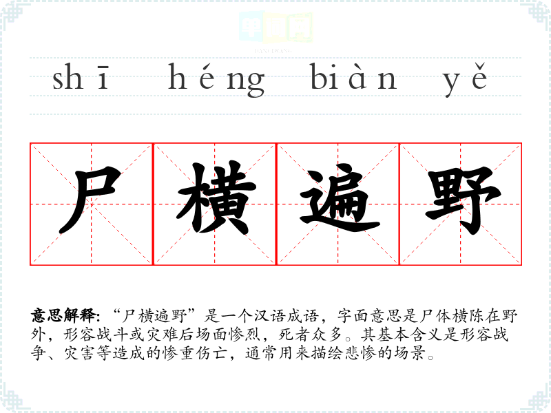 “尸横遍野”是一个汉语成语,字面意思是尸体横陈在野外,形容战斗或灾难后场面惨烈,死者众多。其基本含义是形容战争、灾害等造成的惨重伤亡,通常用来描绘悲惨的场景。