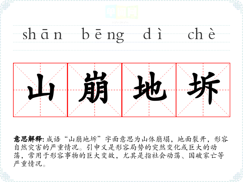 成语“山崩地坼”字面意思为山体崩塌,地面裂开,形容自然灾害的严重情况。引申义是形容局势的突然变化或巨大的动荡,常用于形容事物的巨大变故,尤其是指社会动荡、国破家亡等严重情况。