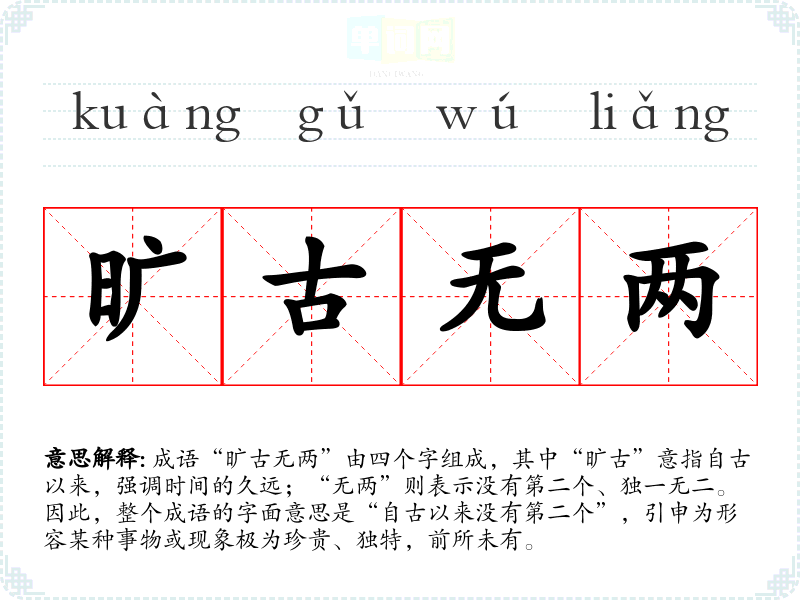 成语“旷古无两”由四个字组成,其中“旷古”意指自古以来,强调时间的久远;“无两”则表示没有第二个、独一无二。因此,整个成语的字面意思是“自古以来没有第二个”,引申为形容某种事物或现象极为珍贵、独特,前所未有。