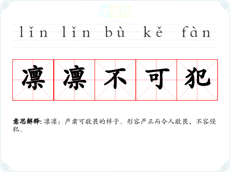 | 凛凛不可犯 | 凛凛:严肃可敬畏的样子。形容严正而令人敬畏,不容侵犯。 |