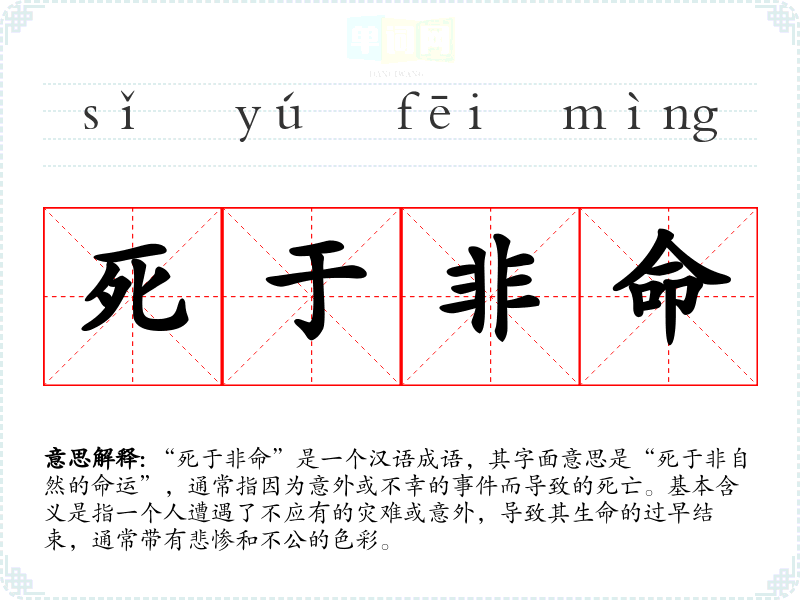 “死于非命”是一个汉语成语,其字面意思是“死于非自然的命运”,通常指因为意外或不幸的**而导致的死亡。基本含义是指一个人遭遇了不应有的灾难或意外,导致其生命的过早结束,通常带有悲惨和不公的色彩。