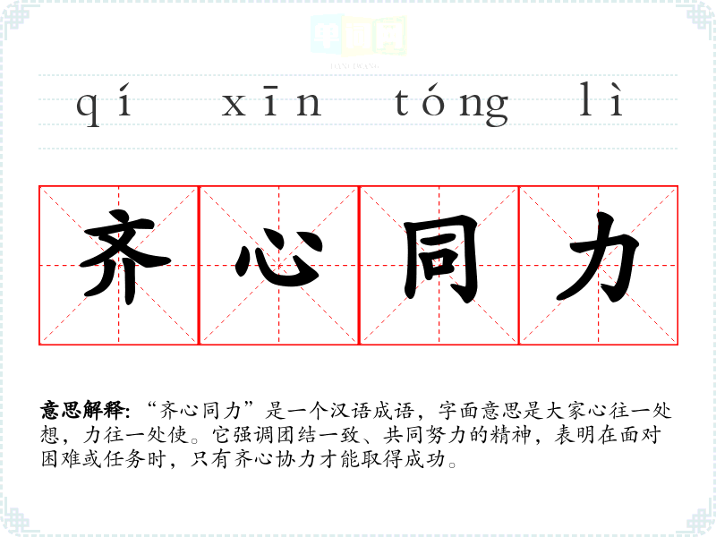 “齐心同力”是一个汉语成语,字面意思是大家心往一处想,力往一处使。它强调团结一致、共同努力的精神,表明在面对困难或任务时,只有齐心协力才能取得成功。