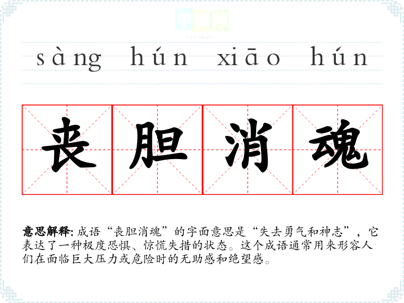 成语“丧胆消魂”的字面意思是“失去勇气和神志”,它表达了一种极度恐惧、惊慌失措的状态。这个成语通常用来形容人们在面临巨大压力或危险时的无助感和绝望感。