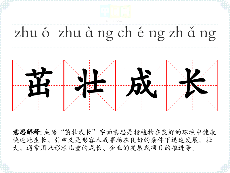 成语“茁壮成长”字面意思是指植物在良好的环境中健康快速地生长。引申义是形容人或事物在良好的条件下迅速发展、壮大,通常用来形容儿童的成长、企业的发展或项目的推进等。
